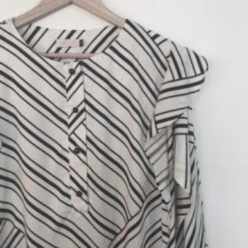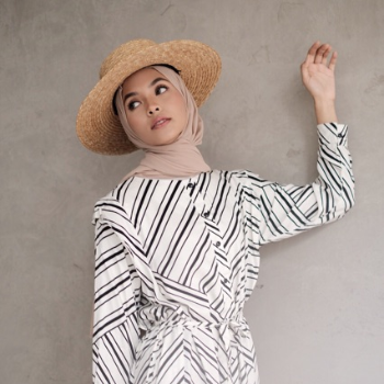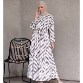 Bahan Rayon Viscose Karena bahan dasar putih, cenderung menerawang. Model menggunakan dalaman. Ada kancing depan, dan di pergelangan tangan. Tali pinggang bisa dilepas
